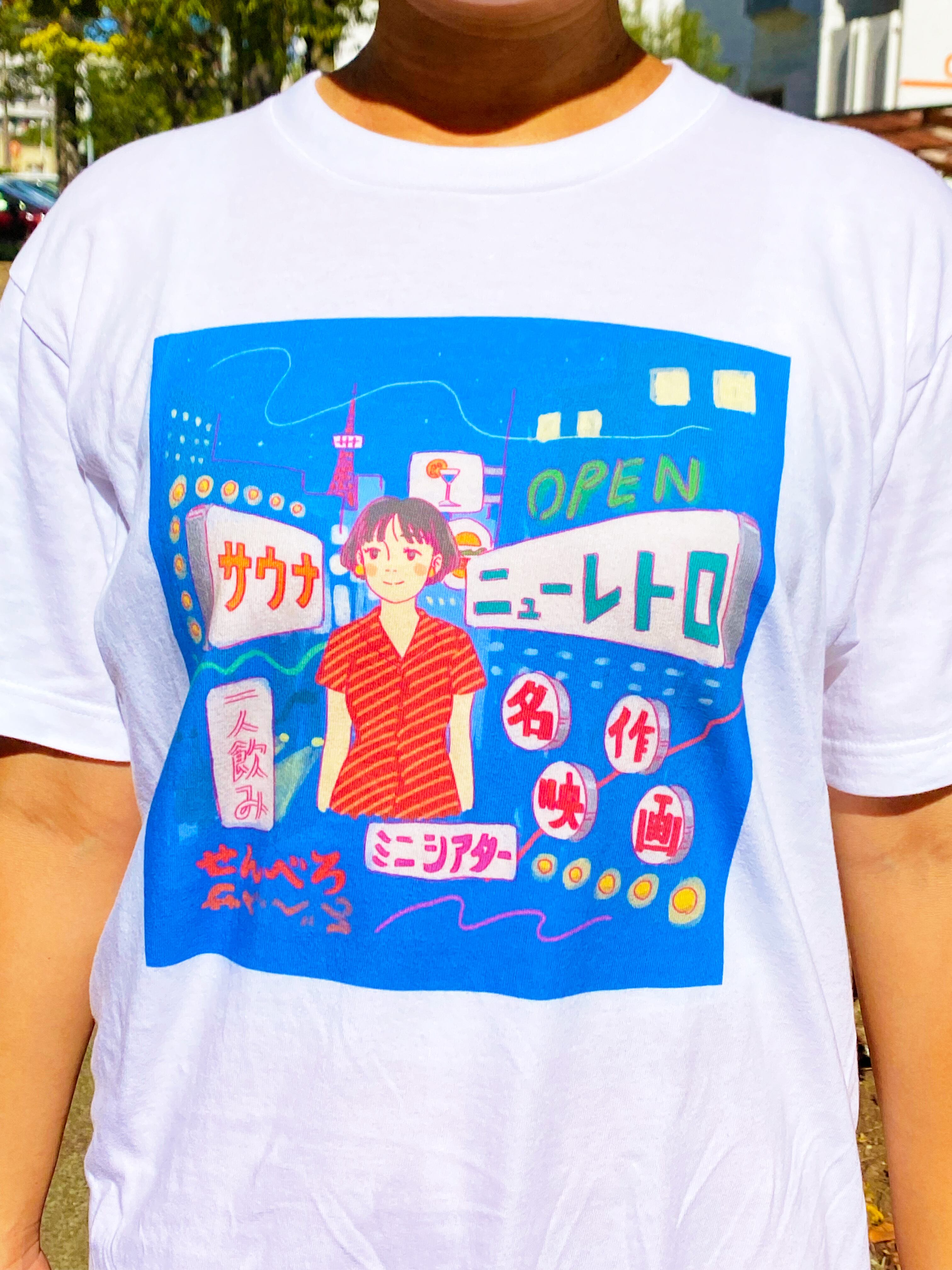 ニュ〜レトロな楽しい夜の都会さんぽのTシャツです♪写真は身長157cmでM着用。